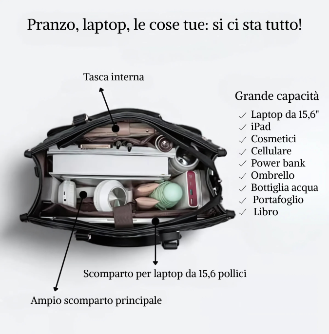 La borsa che semplifica la tua giornata. Eleganza e praticità in un unico gesto.
